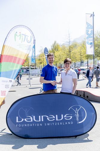 Auf dem Vorplatz der Messe vergnügten sich bei bestem Wetter zahlreiche MiTu-Familien und Messebesucher auf dem Mini Veloparcour. Die Laureus-Botschafter Fabian Cancellara, Mario Gyr, Marcel Hug und Carlos Lima unterstützten die Familien und gaben fleissig Autogramme. Ein besonderes Highlight für die Besucher war ausserdem das Showrennen der Laureus-Botschafter.